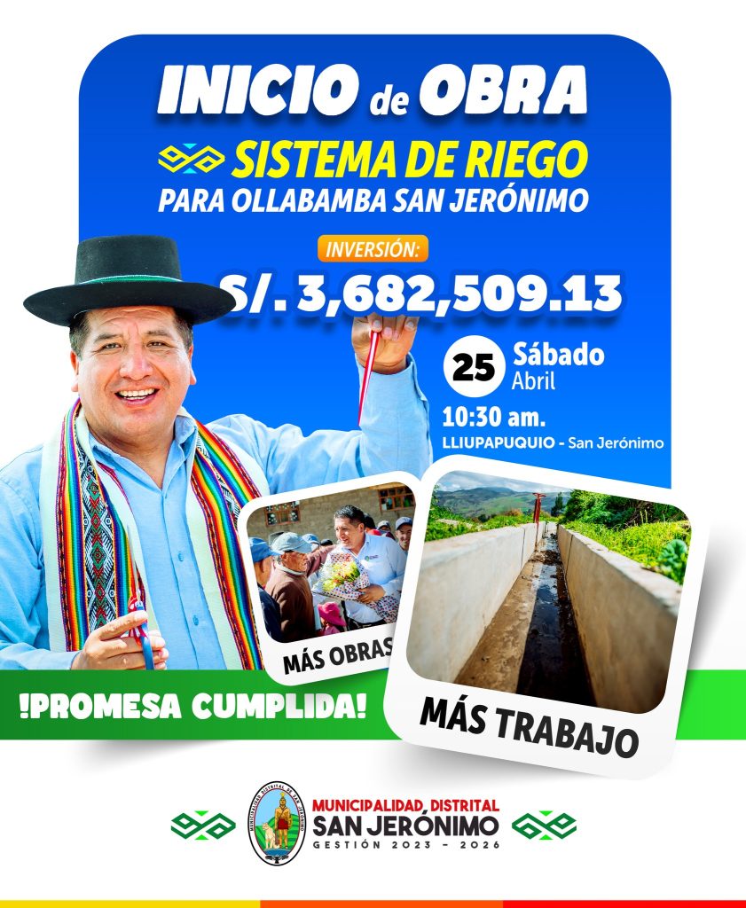 CON UNA INVERSION DE S/. 3,682,509.13, LA MUNICIPALIDAD DISTRITAL DE SAN JERÓNIMO DARÁ INICIO A LA OBRA “MEJORAMIENTO DEL SISTEMA DE RIEGO OLLABAMBA – HUAYLLUCANCHA DEL DISTRITO DE SAN JERÓNIMO – ANDAHUAYLAS – APURÍMAC” noticias, Obras / Elí Kevin Cceñua Quispe CON UNA INVERSION DE S/. 3,682,509.13, LA MUNICIPALIDAD DISTRITAL DE SAN JERÓNIMO DARÁ INICIO A LA OBRA “MEJORAMIENTO DEL SISTEMA DE RIEGO OLLABAMBA – HUAYLLUCANCHA DEL DISTRITO DE SAN JERÓNIMO – ANDAHUAYLAS – APURÍMAC” Read More »