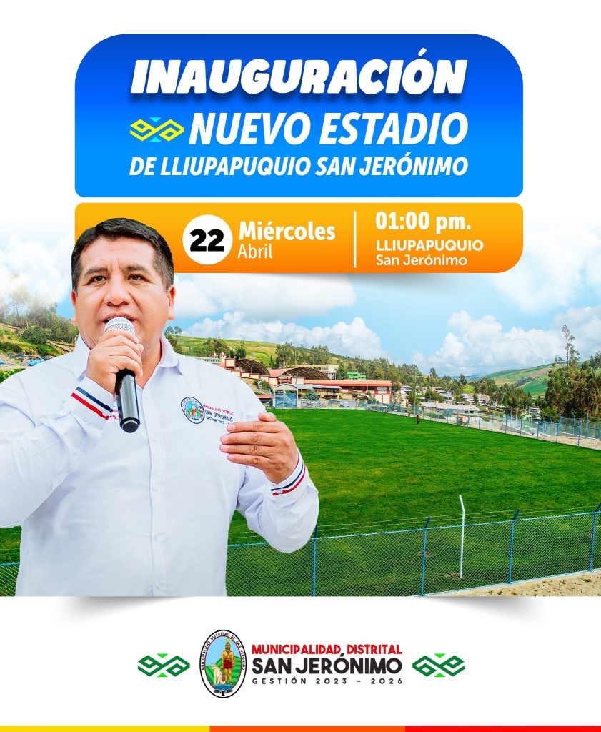 El alcalde de la municipalidad de San Jerónimo, Sabino Portillo, regidores invitan a las autoridades, medios de comunicación, población a la gran inauguración del Estadio en el Centro Poblado de Lliupapuquio, una obra que entregamos a la ciudadanía en beneficio del deporte y la juventud. La actividad está programada para el miércoles 22 de abril […]