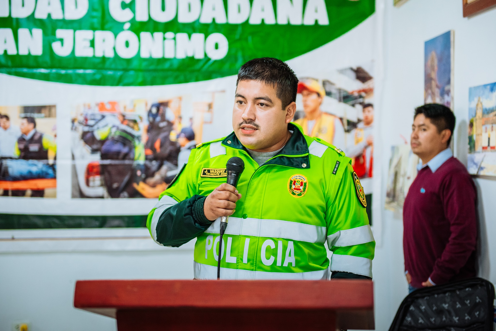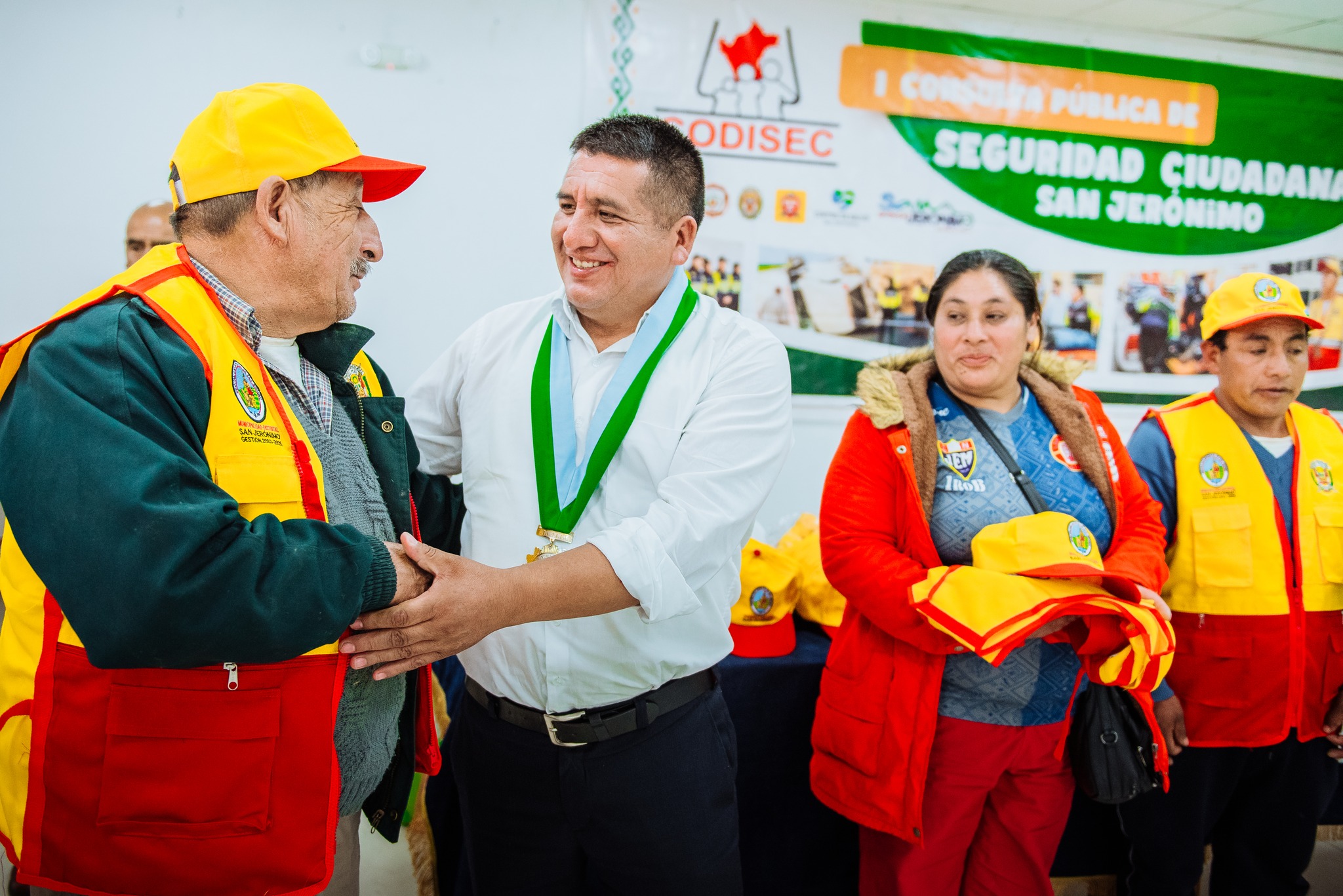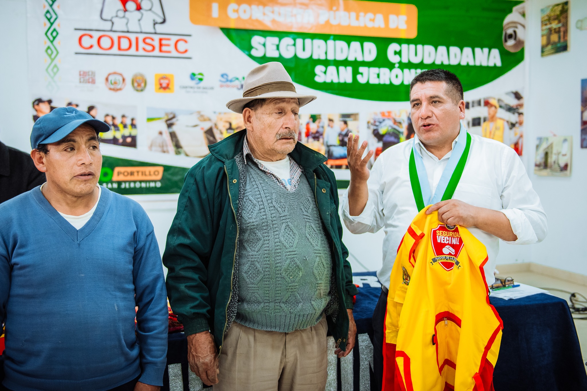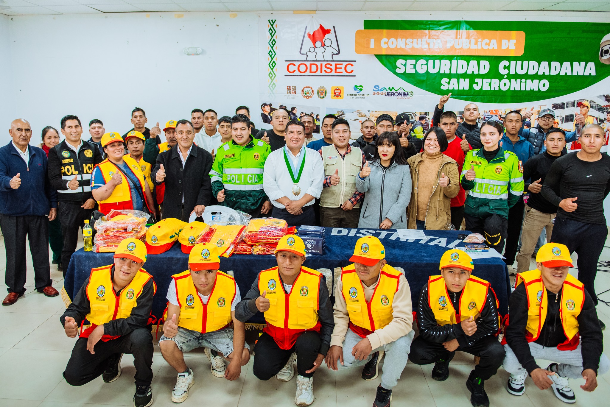 En cumplimiento de lo establecido en la Ley N.º 27933, Ley del Sistema Nacional de Seguridad Ciudadana, el alcalde distrital y presidente del Comité Distrital de Seguridad Ciudadana dio apertura a la “I Consulta Pública de Seguridad Ciudadana 2026”, actividad que se desarrolló en el auditorio del local institucional con la participación de representantes de las instituciones que integran este comité, así como de la población jeronimiana. Durante la sesión, el secretario técnico del Codisec informó y expuso las principales problemáticas registradas durante el primer trimestre del presente año en materia de seguridad ciudadana. Posteriormente, el comisario de la PNP - Comisaría de San Jerónimo detalló las acciones y labores que se vienen ejecutando para fortalecer la seguridad y el orden público en el distrito. En otro momento, el alcalde distrital realizó la entrega simbólica de indumentaria para las juntas vecinales, consistente en chalecos, gorras y silbatos, implementos que contribuirán a reforzar el trabajo articulado entre la población organizada y la Policía Nacional del Perú. Dichos implementos fueron recepcionados por los representantes de la PNP - Comisaría de San Jerónimo.